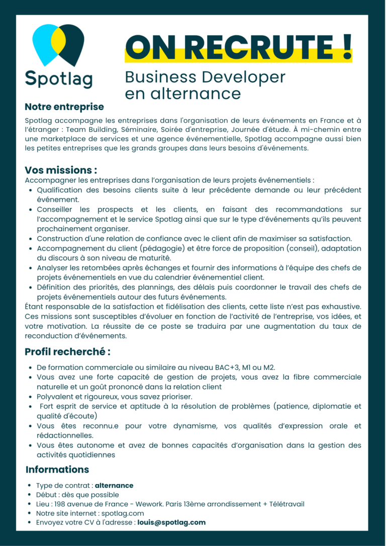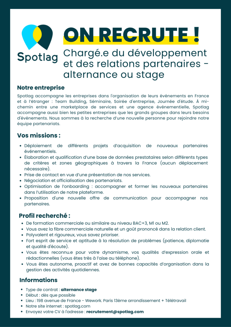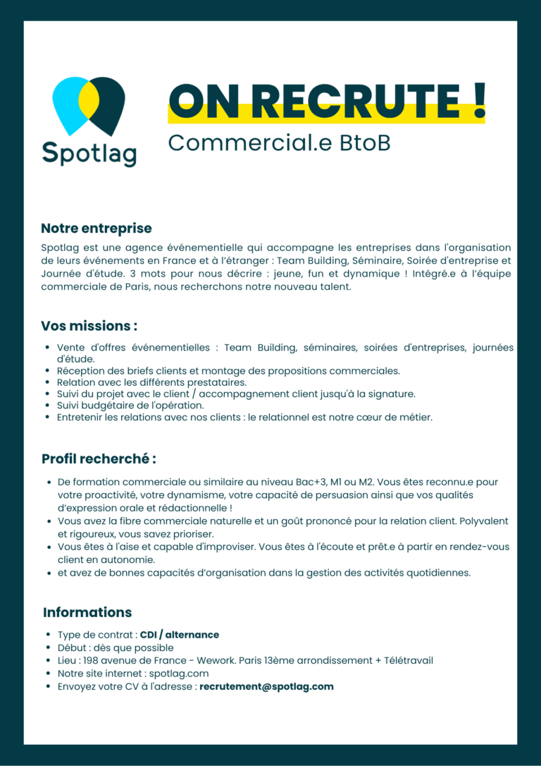 Toute réclamation ou contestation devra être adressée par courrier recommandé avec accusé de réception à SPOTLAG, 59 rue de Ponthieu – Bureau 526, 75008 PARIS, dans un délai de 7 jours maximum à compter de la fin de la prestation organisée. Passé ce délai, aucune réclamation ou contestation ne sera recevable.